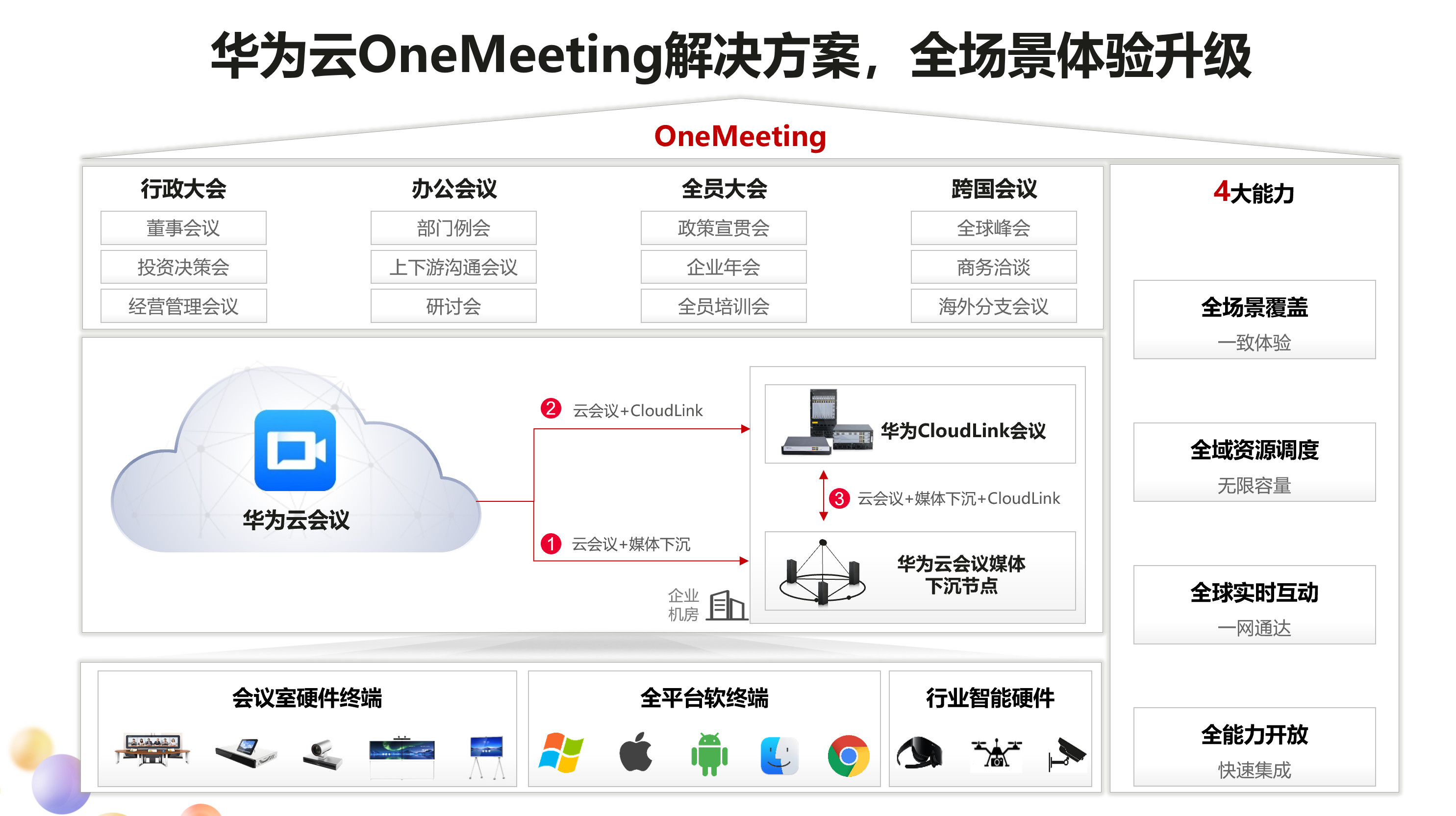 Huawei Cloud OneMeeting full scene video conference solution, by virtue of its leading core capabilities in the whole industry, enables government and enterprise users to smoothly conduct full scene meetings involving multiple devices, groups and even all members in real time anywhere, at any time, in the world, so as to enable the upgrading of the full scene experience of government and enterprise video meetings and help government and enterprise customers to take the lead in the digital age.
